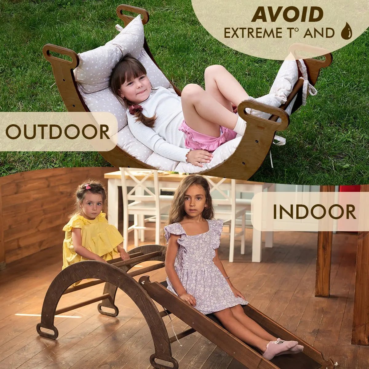 Double-sided design: One smooth side serves as a slide while the other, equipped with five wooden planks, becomes a climbing ramp. This dual function enriches playtime, offering both ascent and descent activities.