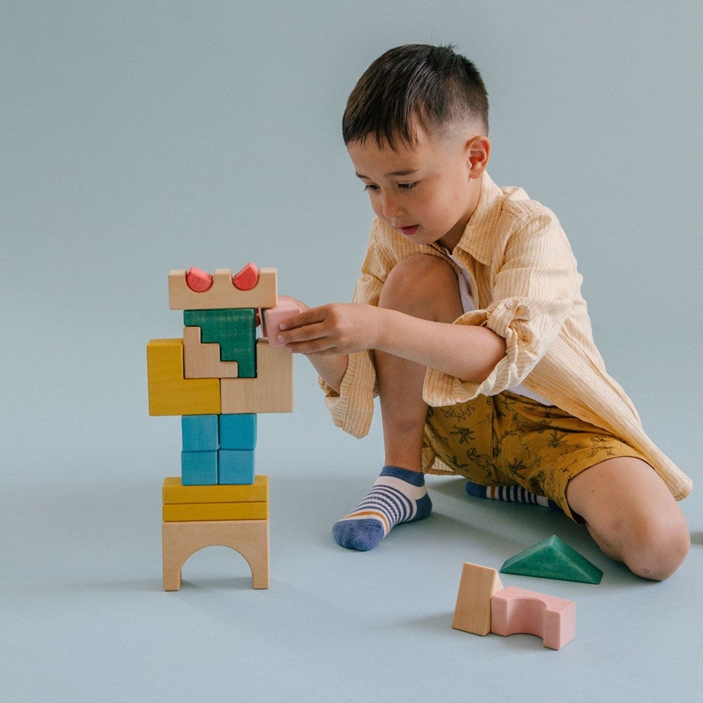 Lorsque les cubes ne suffisent pas et que vous avez besoin de formes plus créatives pour bousculer votre architecture, le petit bloc d'Avdar est la solution parfaite. L'ensemble de 23 pièces comprend différentes formes et couleurs pour un jeu ouvert.