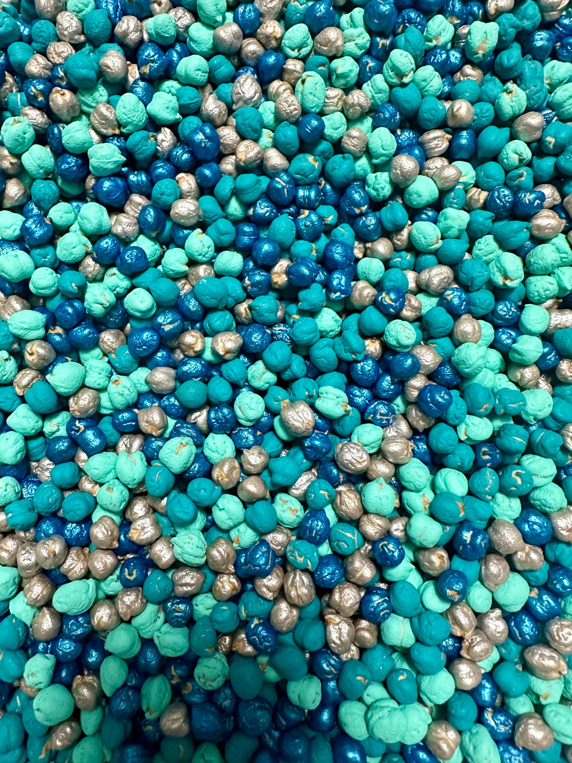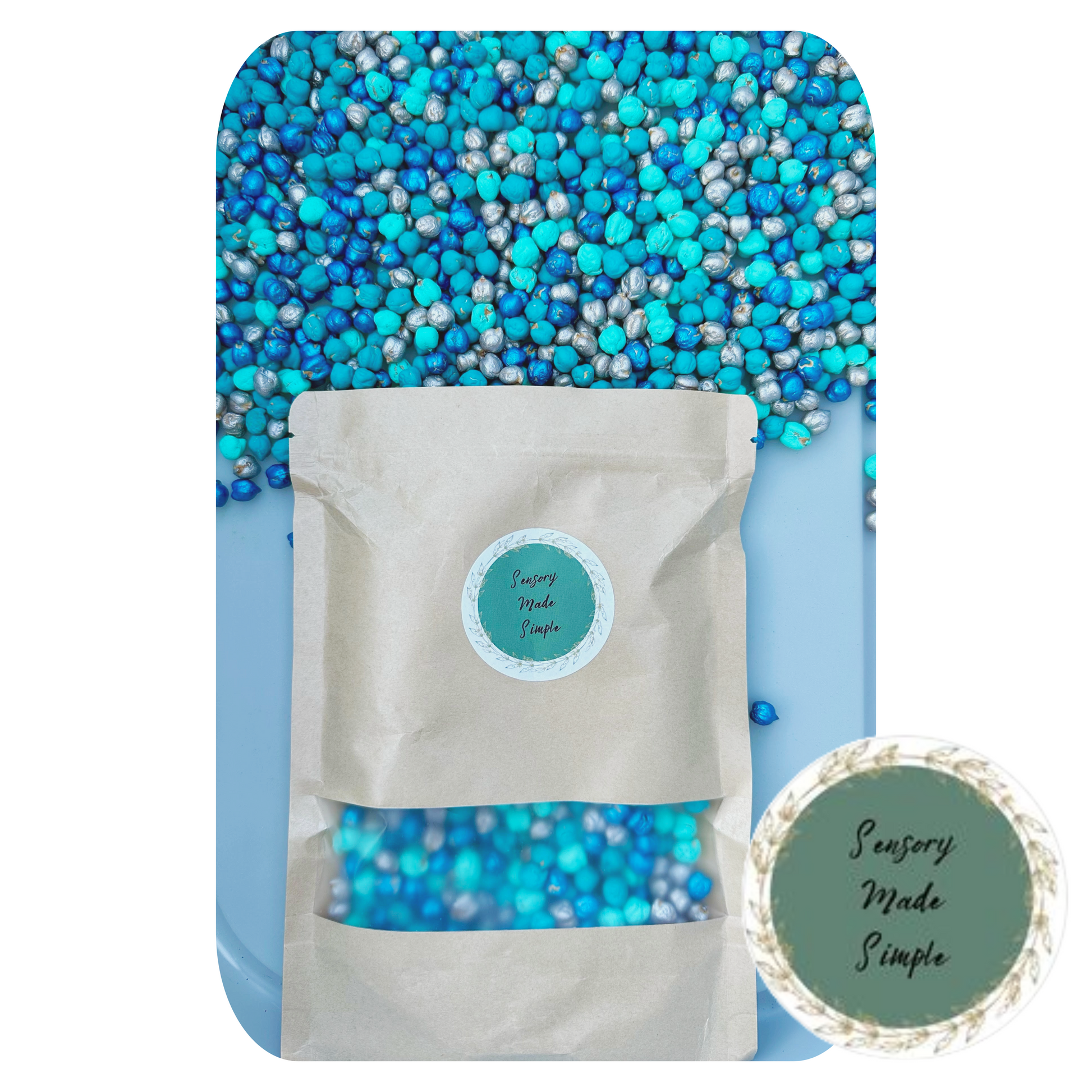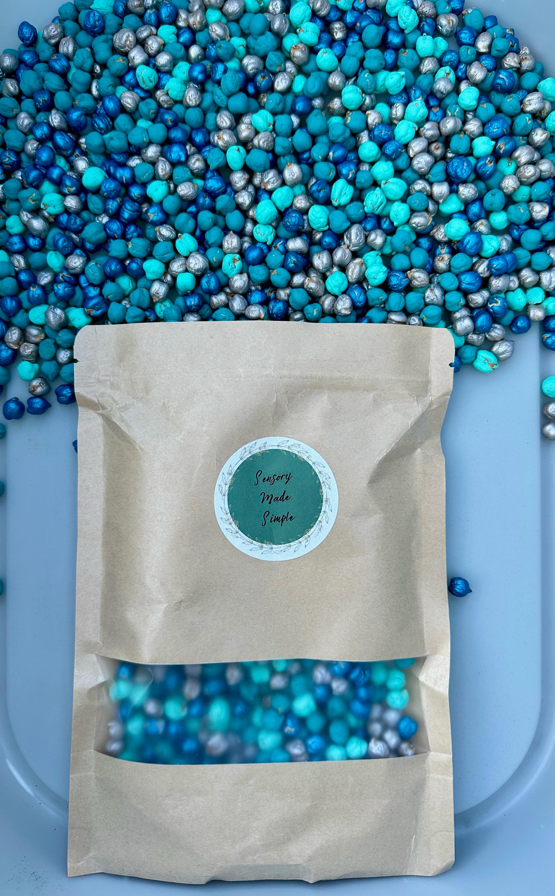 Base de pois chiche peinte à l'acrylique avec des touches de bleu et d'argent. Une excellente base à utiliser pour les bacs à thème aquatique ou une activité de tri. Teint à la main et mélangé en petits lots. Veuillez noter que tous les lots peuvent présenter de légères variations de couleur.