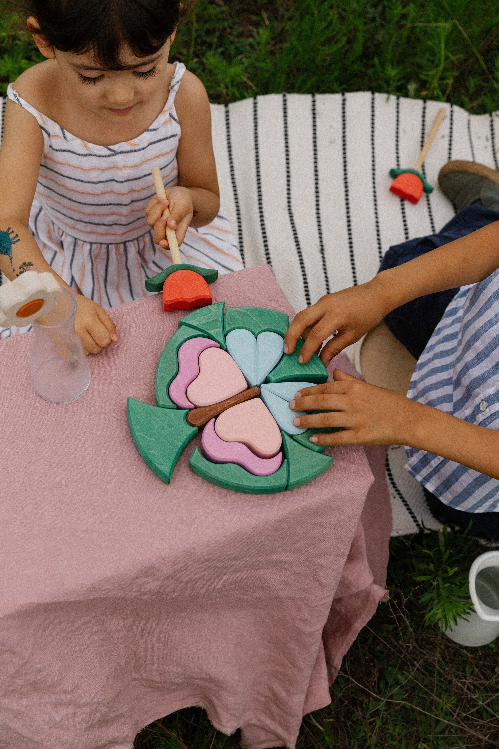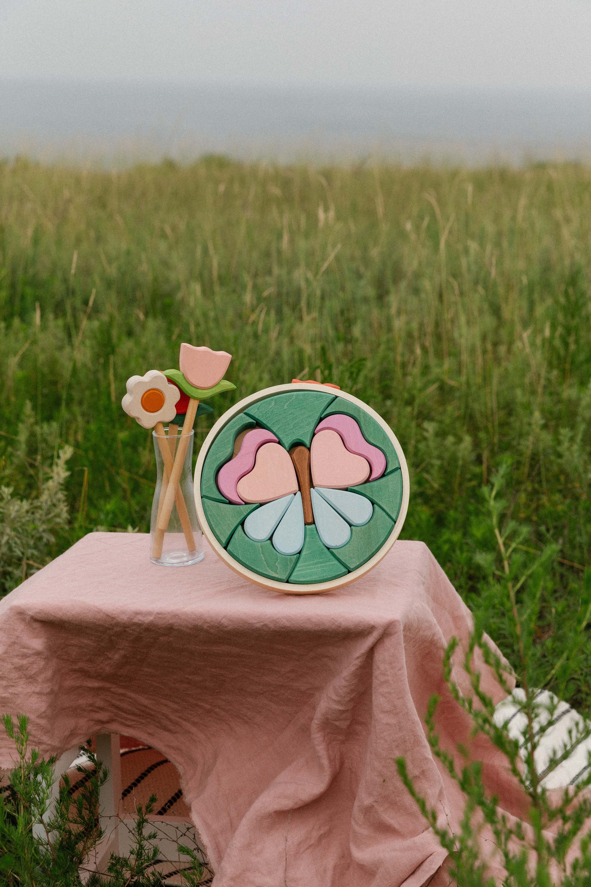 Le Butterfly Puzzle est un jouet unique qui possède à la fois des fonctions de puzzle et de construction. Il comporte 16 blocs de formes et de blocs différents. Chaque bloc a été découpé, poncé et peint à la main à partir d'un bois massif. Chaque pièce est faite de tilleul avec un aspect lisse et texture veloutée. Ce puzzle est idéal pour un jeu imaginatif et ouvert.