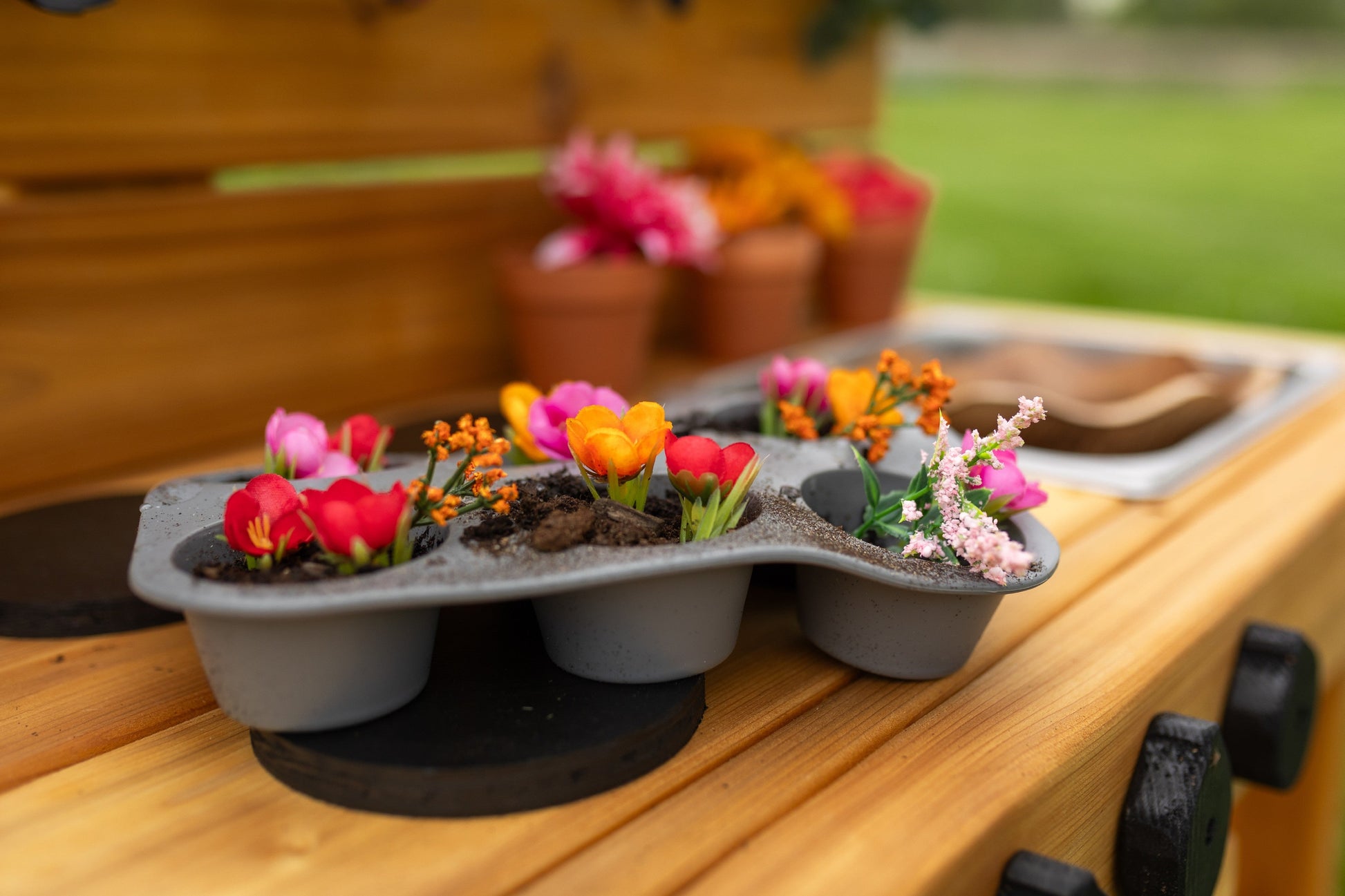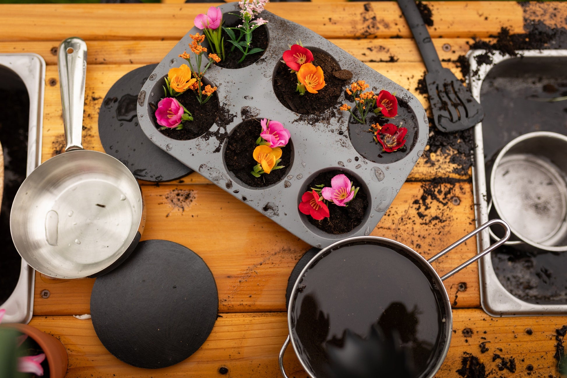 Nous adorons les cuisines en terre battue car les enfants sont libres de se salir autant qu'ils le souhaitent, puisqu'elles sont à l'extérieur, bien sûr ! Les jeux sensoriels, salissants et de simulation sont TRÈS bénéfiques pour les enfants. Ces jolies cuisines en terre battue favorisent le jeu ouvert et les possibilités sont infinies : une soupe de boue, un café factice ou le remplissage des éviers avec des objets sensoriels tels que du riz arc-en-ciel et des perles d'eau ne sont que quelques exemples !