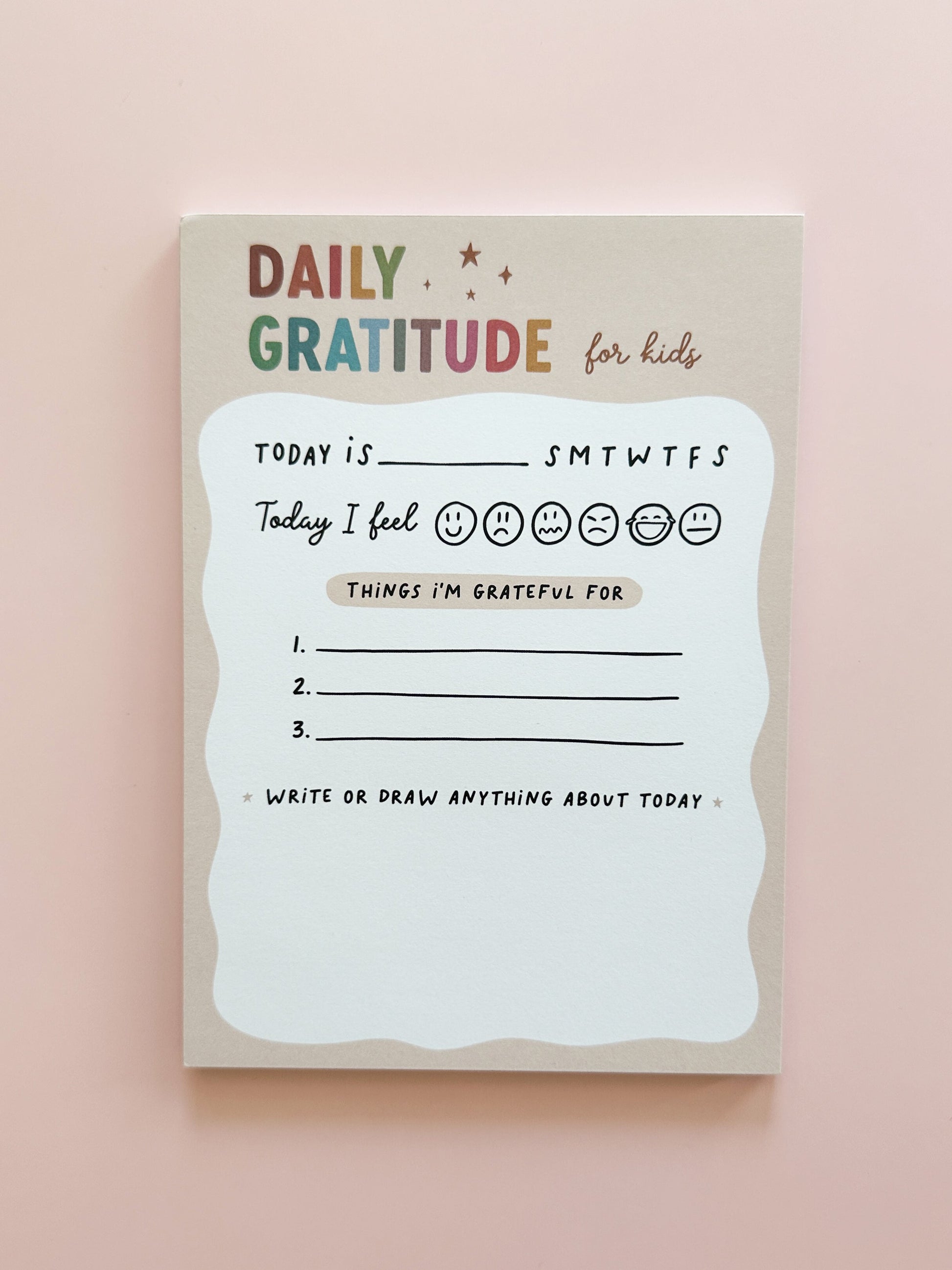 Get ready to sprinkle gratitude into your child's day with our Daily Gratitude notepad. This playful notepad is designed to spark meaningful conversations and prompt moments of reflection with your little one, making gratitude a fun part of their day.