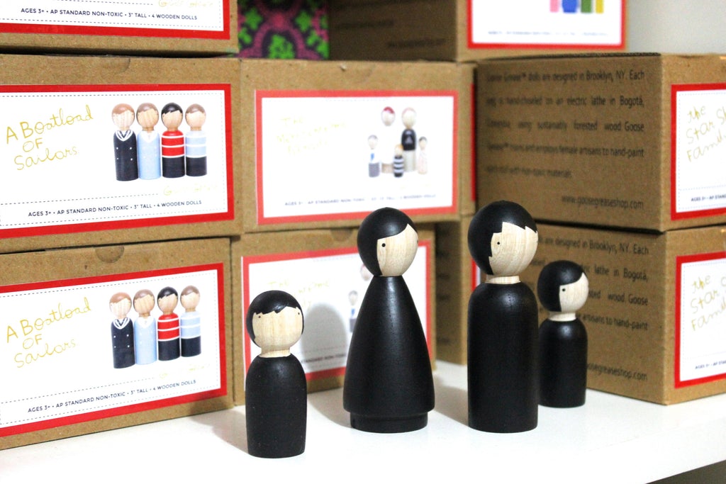 Ciselé à la main du bois d'Urapán sur un tour électrique, ces classiques poupées en bois en ont fini avec Fabriqué aux États-Unis, non toxique peintures à l'eau. Chaque poupée est unique et sans danger pour les petites mains. Nous concevons nos poupées dans notre studio de Brooklyn et travaillons avec des artisans de Bogota - Colombie pour nous aider à reproduire nos créations. Notre menuisier utilise des arbres récoltés de manière durable ; lorsqu’un arbre est utilisé, deux sont plantés. Notre équipe comprend des artisans et artisans formés par Goose Grease, de Bogota à Brooklyn, et chaque poupée est soigneusement dessinée et peinte à la main du début à la fin.