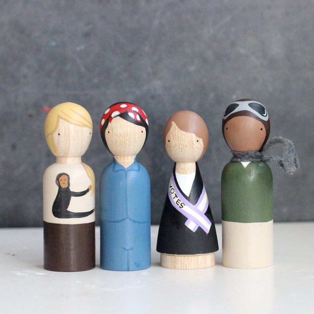 L'ensemble de poupées Trailblazers comprend quatre poupées de 3,5 pouces : Jane Goodall, Suffragette, Rosie the Riveter et Bessie Coleman.