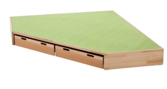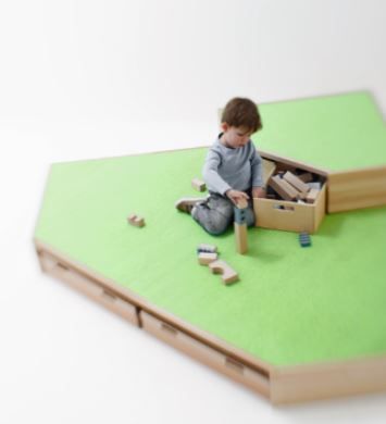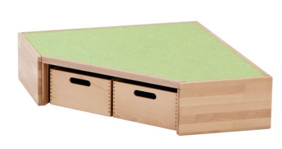 Cet ensemble de plateformes favorise le développement de l'enfant et l'aide à grandir avec des capacités motrices optimales et une imagination fertile. Le sens de la coordination d'un enfant se développe plus rapidement lorsque celui-ci joue sur une plateforme. L'ensemble comprend huit espaces différents pour expérimenter et explorer. Avec quatre bacs de rangement, vous avez également de la place pour les outils d'apprentissage, les livres ou d'autres équipements de jeu. Un espace idéal pour les plus petits, ces plateformes offrent une base sûre pour la construction et le jeu créatif. Toutes les plateformes sont recouvertes de moquette Tretford Wasabi Green-T622. Cadres en bois de hêtre massif. Fabriqué en Allemagne.