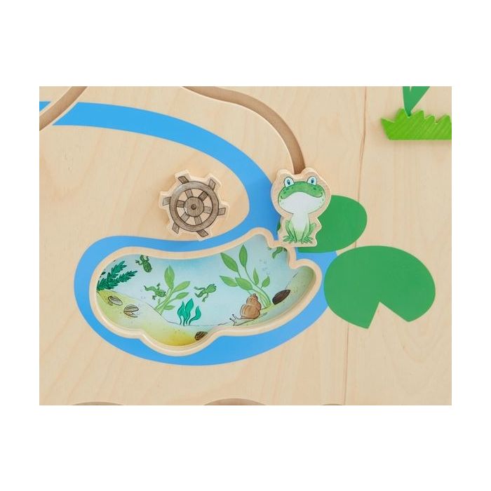 tu glisses sur les touffes d'herbe, les renards et les lapins jouent à cache-cache. Quand tu tournes la roue, tu peux voir comment les grenouilles grandissent. L'abeille vole vers