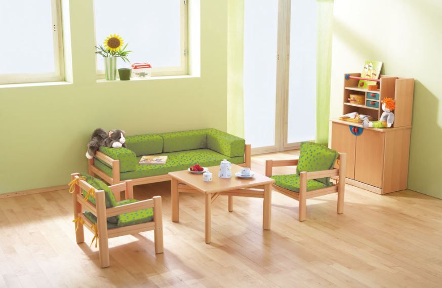 JULE Play Apartment ~ Authentic details and plenty of storage space. Recreating their everyday life, imitating the actions of adults and bringing feelings into new play contexts, they develop emotional and social skills. These play rooms should give children the opportunity to play alone, in pairs or in small groups. The panels and shelves are made of a beech wood veneer, protected by solid edging. Chairs and table legs come with plastic glides to preserve floors. Jule shelves are adjustable at increments of 1½". All elements have quality metal hinges and removable covers made of 100% polyester canvas bione fabric that can be washed at 86°.