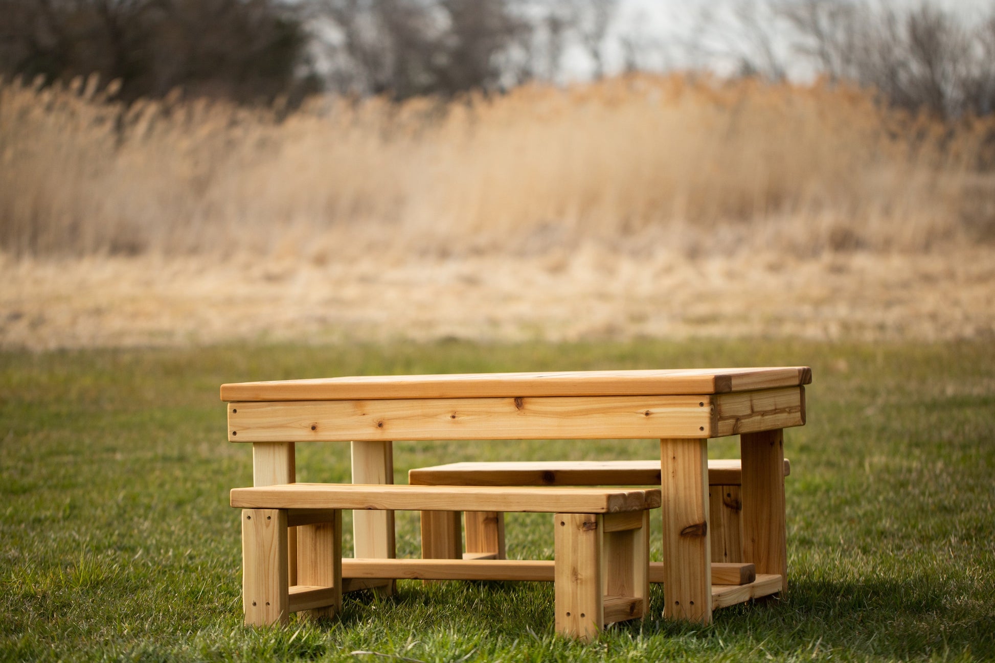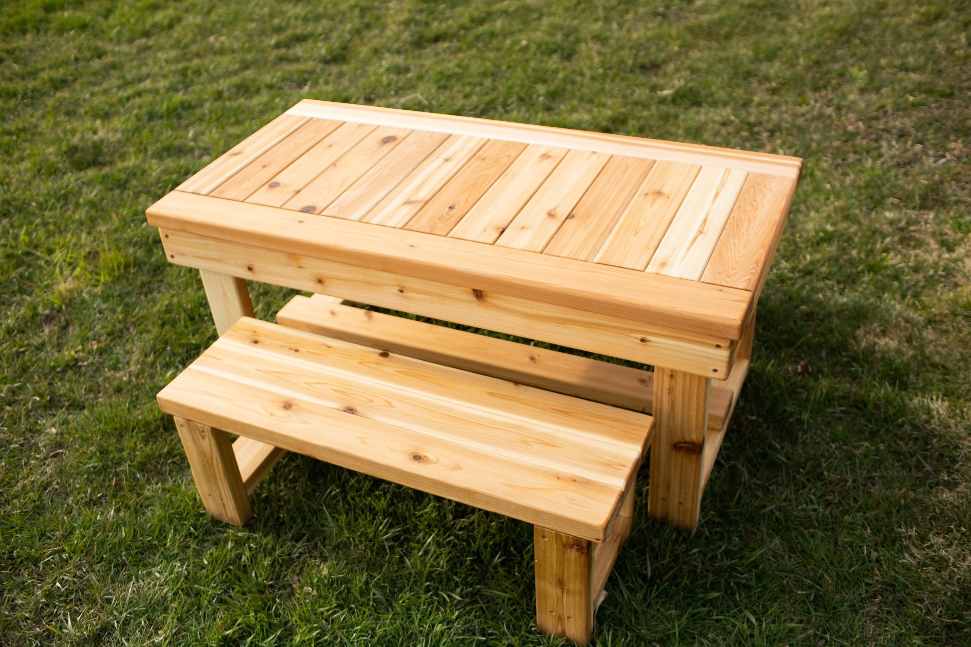 This table is wonderful for use inside or outside your home, or for preschools, schools and daycares. Each table has been carefully hand-sanded smooth for safety and comes finished with Osmo UV ray protectant (a safe and non-toxic finish). It is made of domestically sourced cedar that is known to last for years when left outdoors. We recommend refinishing your table every 2 years or so.