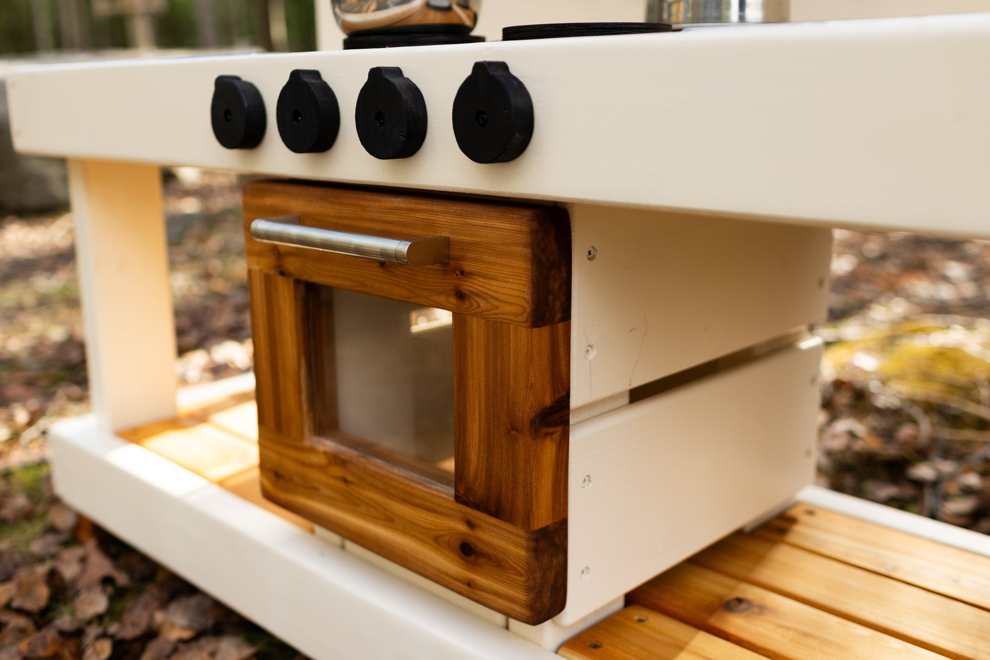 Vous regardez la cuisine en terre cuite avec four à centre peint de Noble Wooden Toys. Ce magnifique meuble de jardin durable et très élégant est même disponible avec un évier et un robinet fonctionnels ; parfait pour jouer dans la boue lors d'une journée d'été.