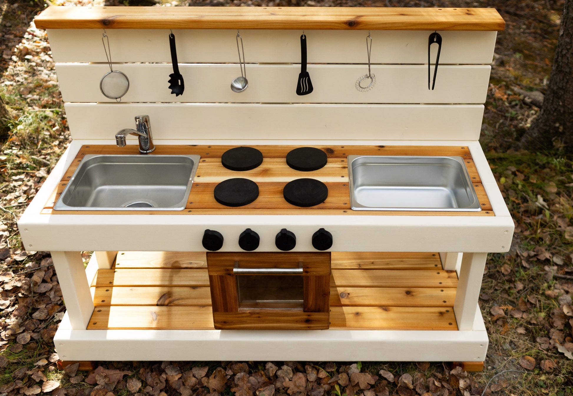 Nous adorons les cuisines en terre battue car les enfants sont libres de se salir autant qu'ils le souhaitent - puisqu'elles sont à l'extérieur bien sûr ! Les jeux sensoriels, salissants et imaginaires sont TRÈS bénéfiques pour les enfants. Les possibilités sont infinies avec ces jolies cuisines en terre battue car elles favorisent le jeu ouvert : soupe de boue, café factice ou remplissage des éviers avec des objets sensoriels tels que du riz arc-en-ciel et des perles d'eau ne sont que quelques exemples !
