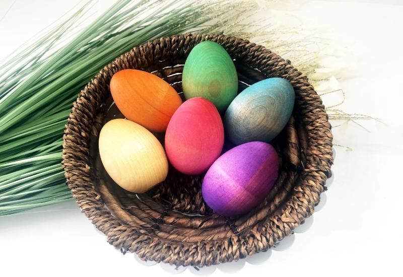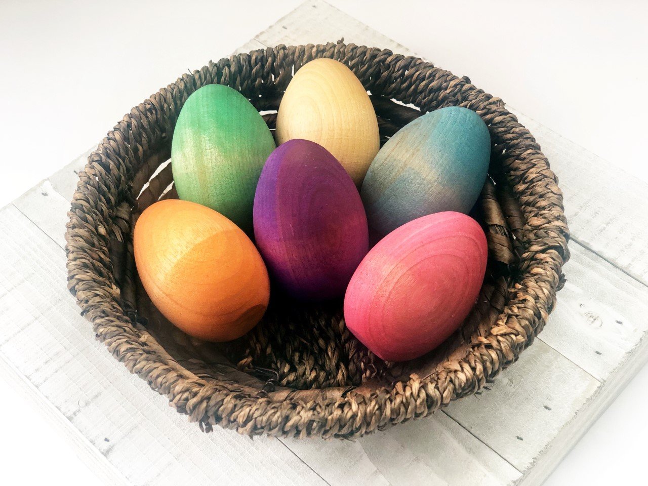 (6) Œufs en bois de 2 1/2", aquarelle arc-en-ciel teintée et scellée avec notre vernis à la cire d'abeille fait maison