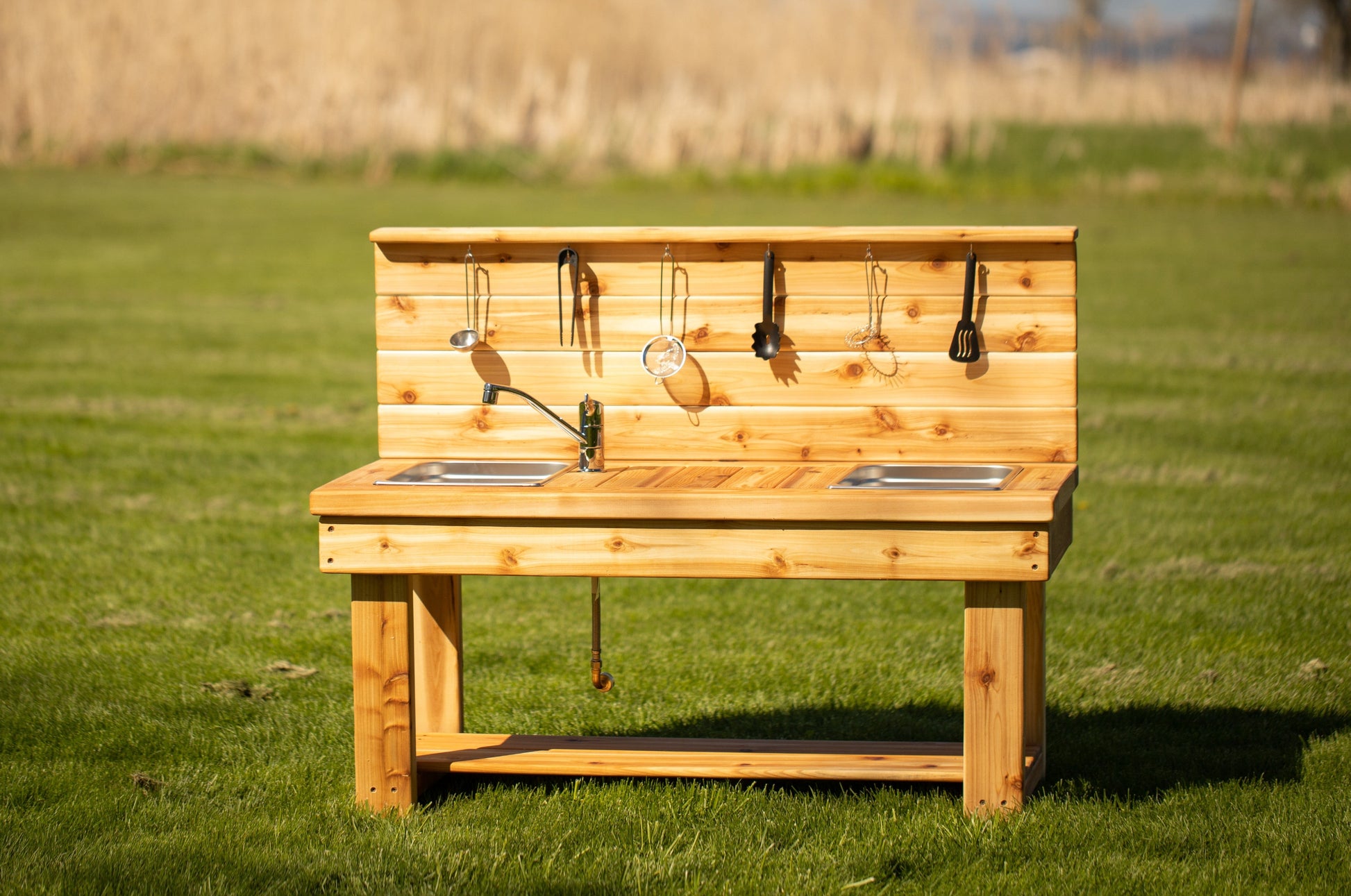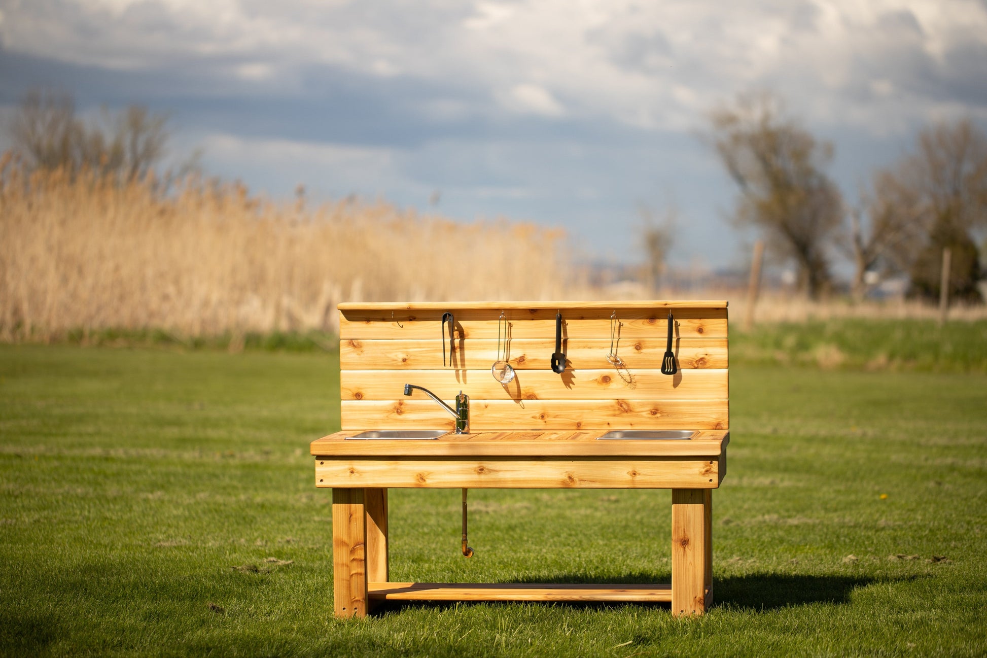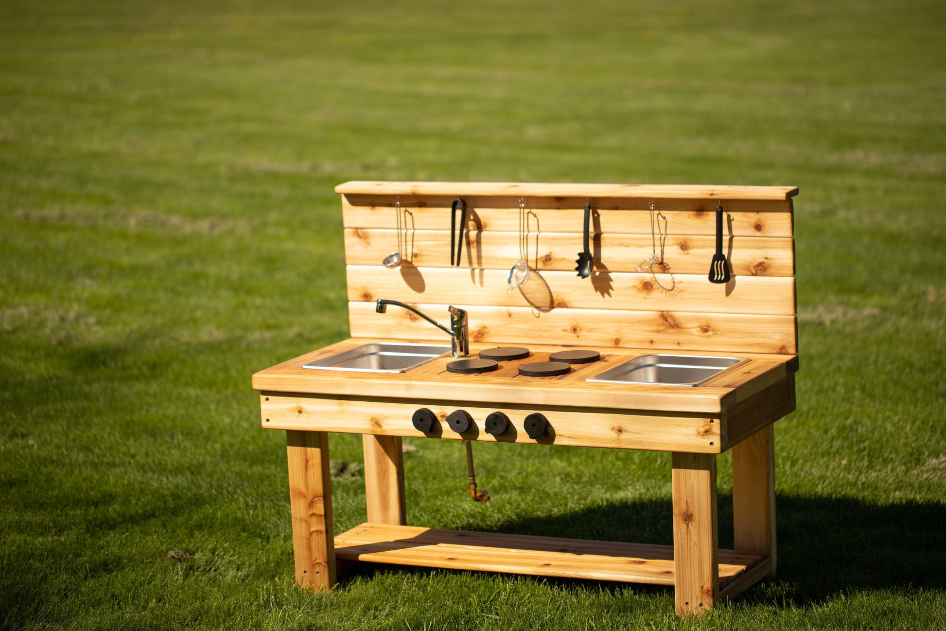Choisissez votre robinet : sans robinet (remarque : aucun robinet d'aucune sorte n'est fourni), robinet en bois : idéal pour jouer à faire semblant, ou robinet en acier : fabriqué en acier inoxydable qui comprend le matériel pour le fixer à un tuyau d'arrosage !