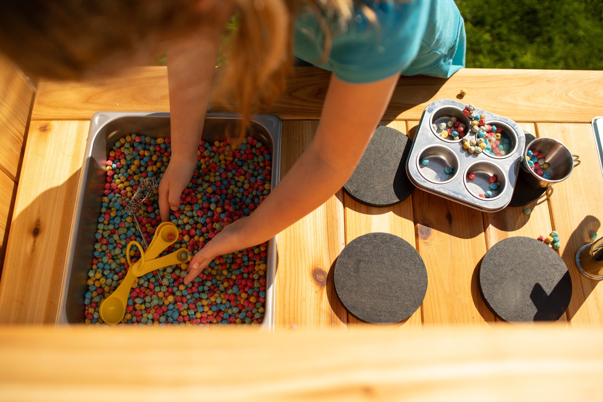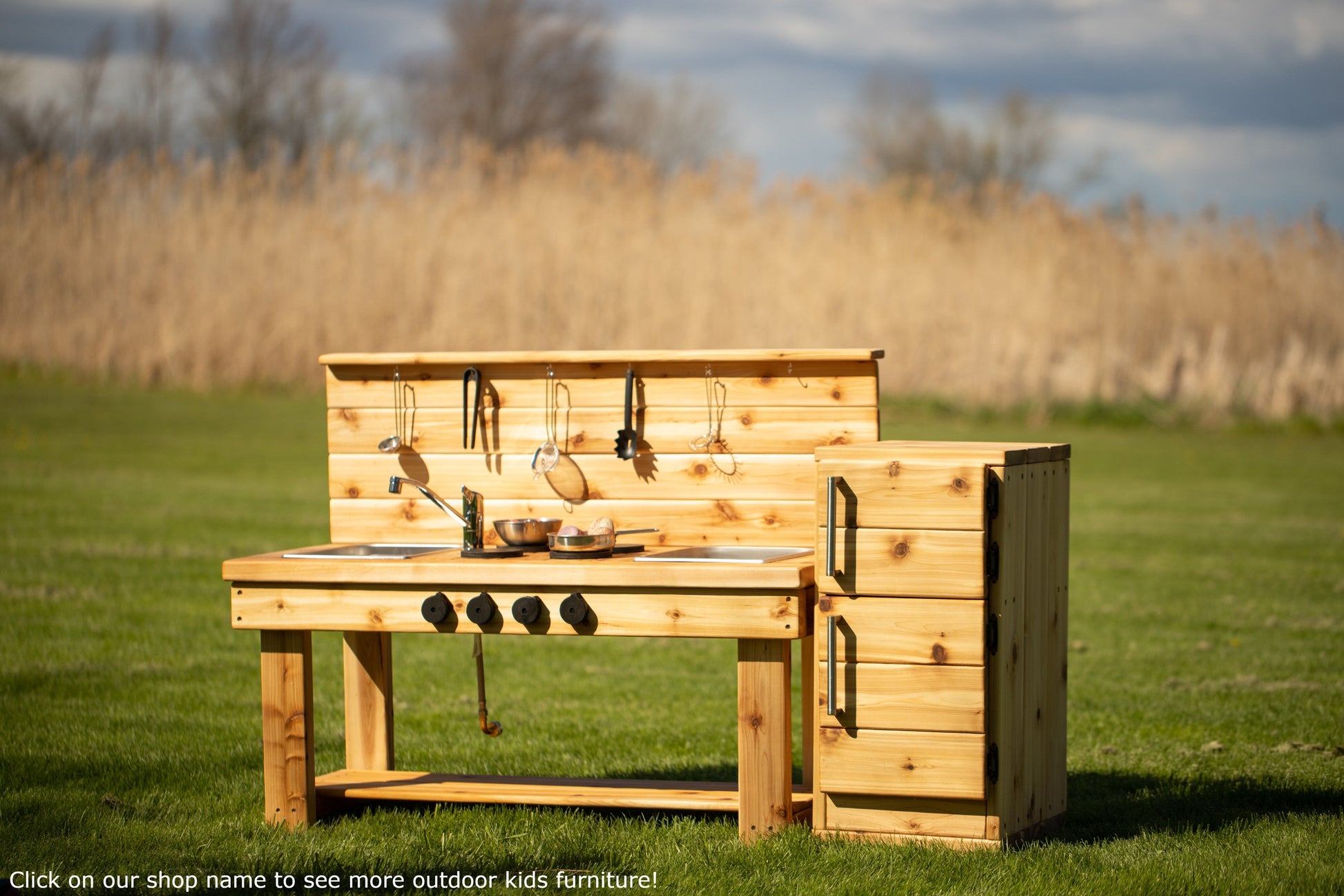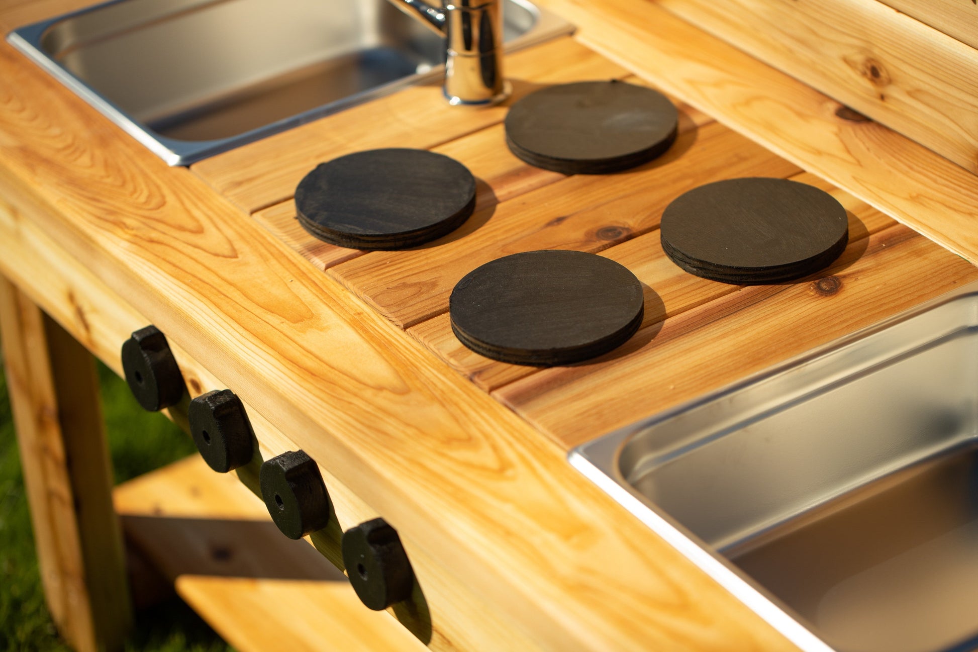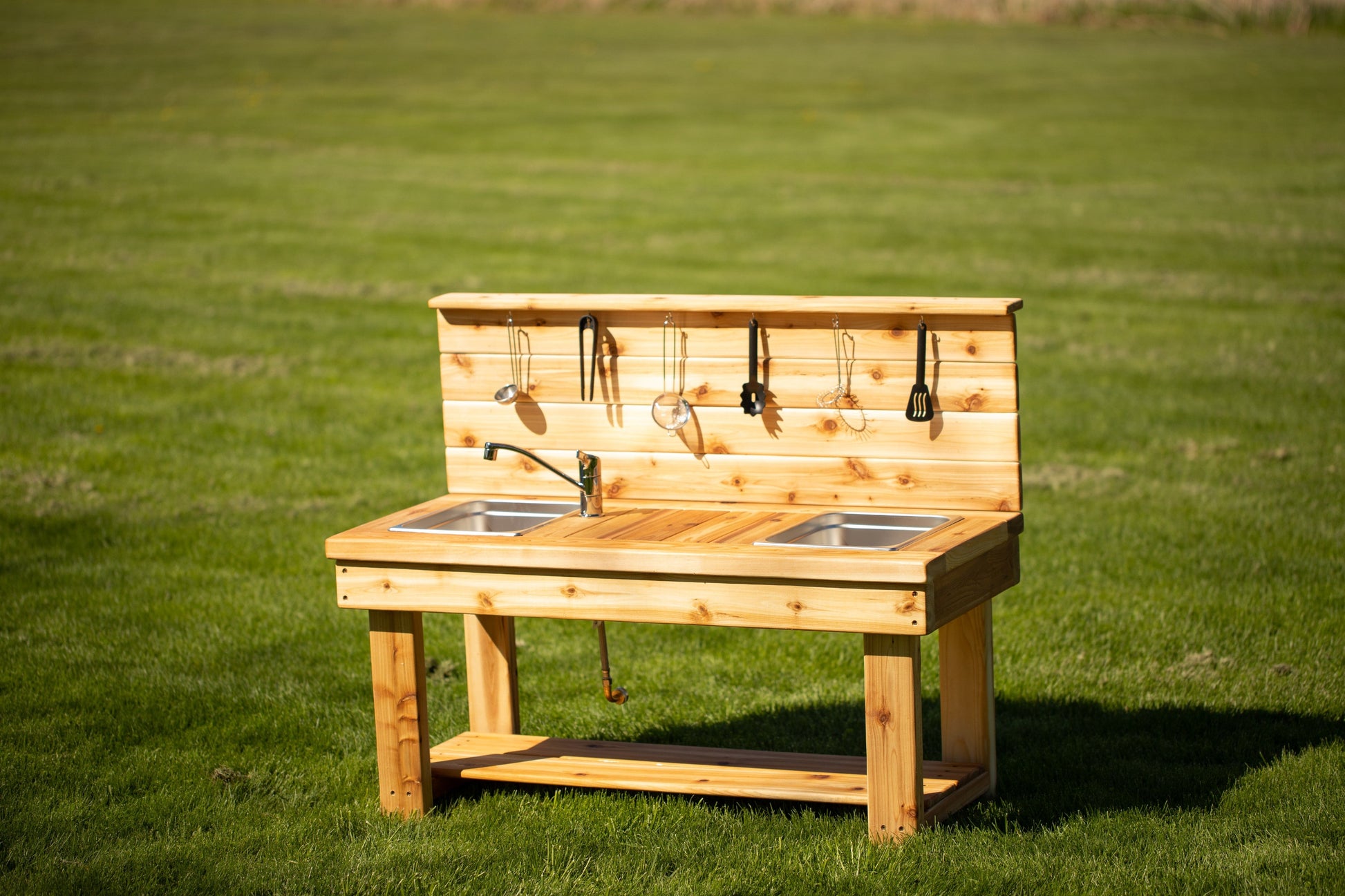 Choisissez votre robinet : sans robinet (remarque : aucun robinet d'aucune sorte n'est fourni), robinet en bois : idéal pour jouer à faire semblant, ou robinet en acier : fabriqué en acier inoxydable qui comprend le matériel pour le fixer à un tuyau d'arrosage !