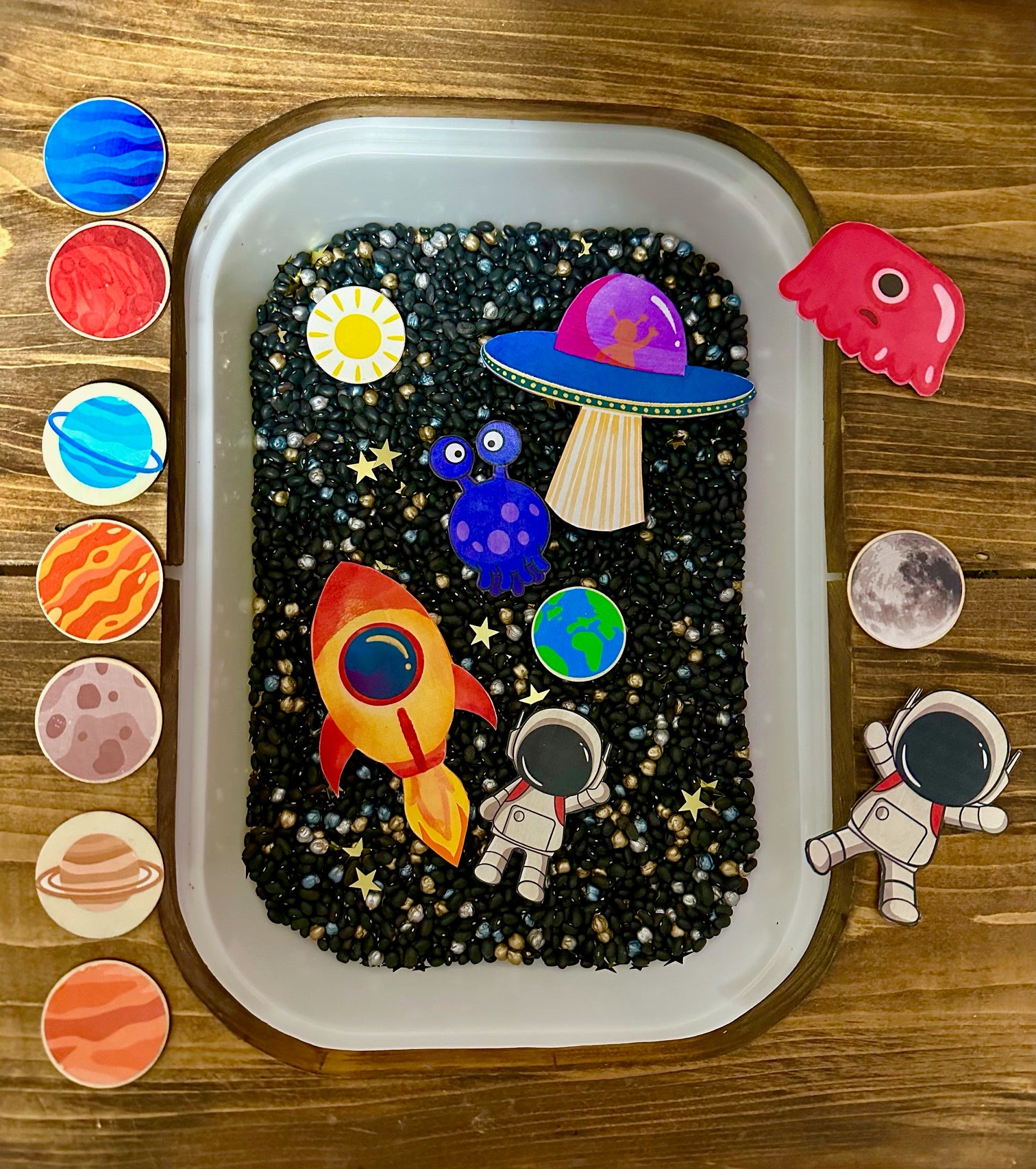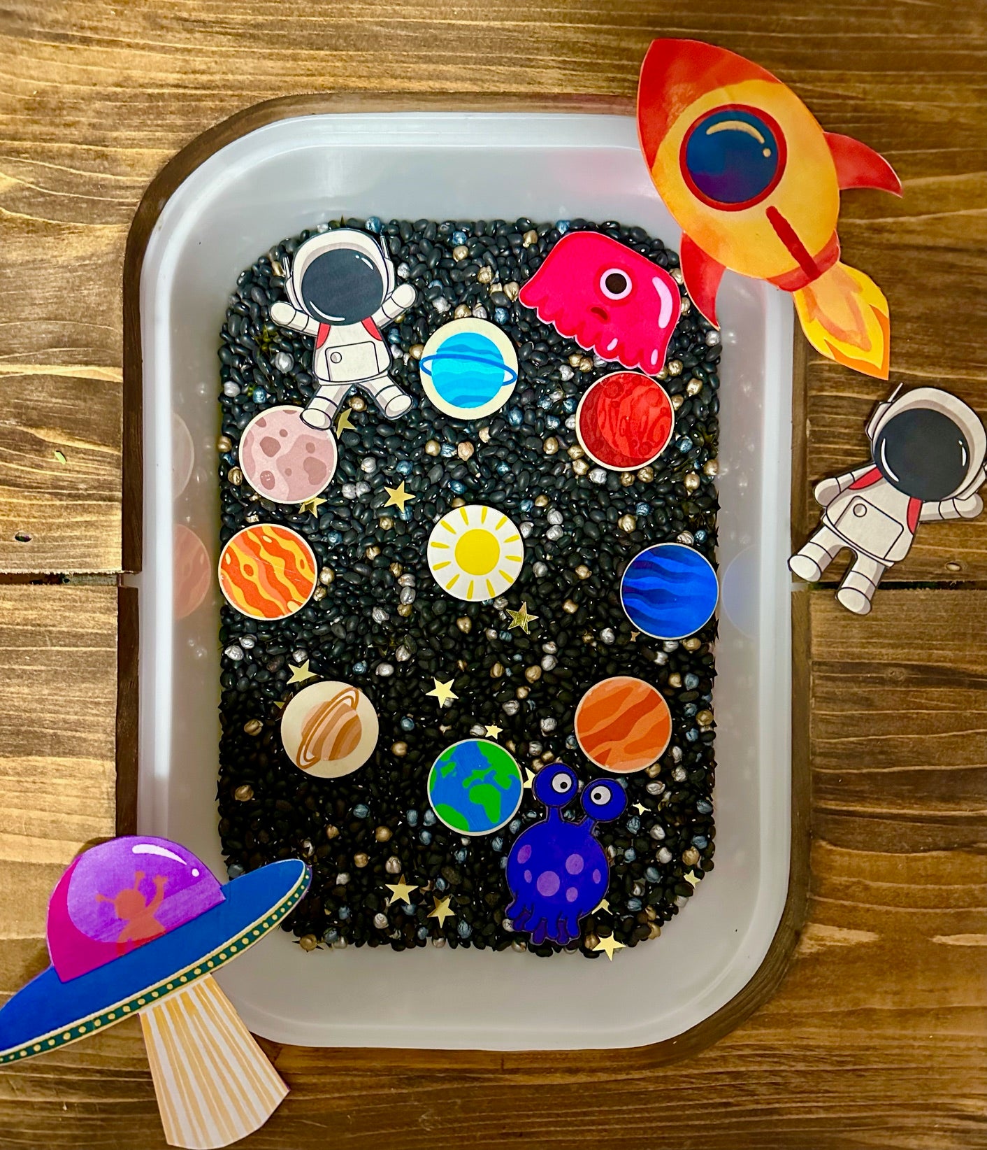3…2…1… Décollage vers le kit sur le thème de l'espace parfait. Des fusées, des OVNI, des extraterrestres et des astronautes encerclant les planètes. Une base de haricots tortue noirs avec des pois chiches métalliques et des étoiles dorées. Un excellent kit d'apprentissage pour tous les petits intéressés par l'apprentissage de l'espace. Teint à la main et mélangé en petits lots. Veuillez noter que tous les lots peuvent présenter de légères variations de couleur.