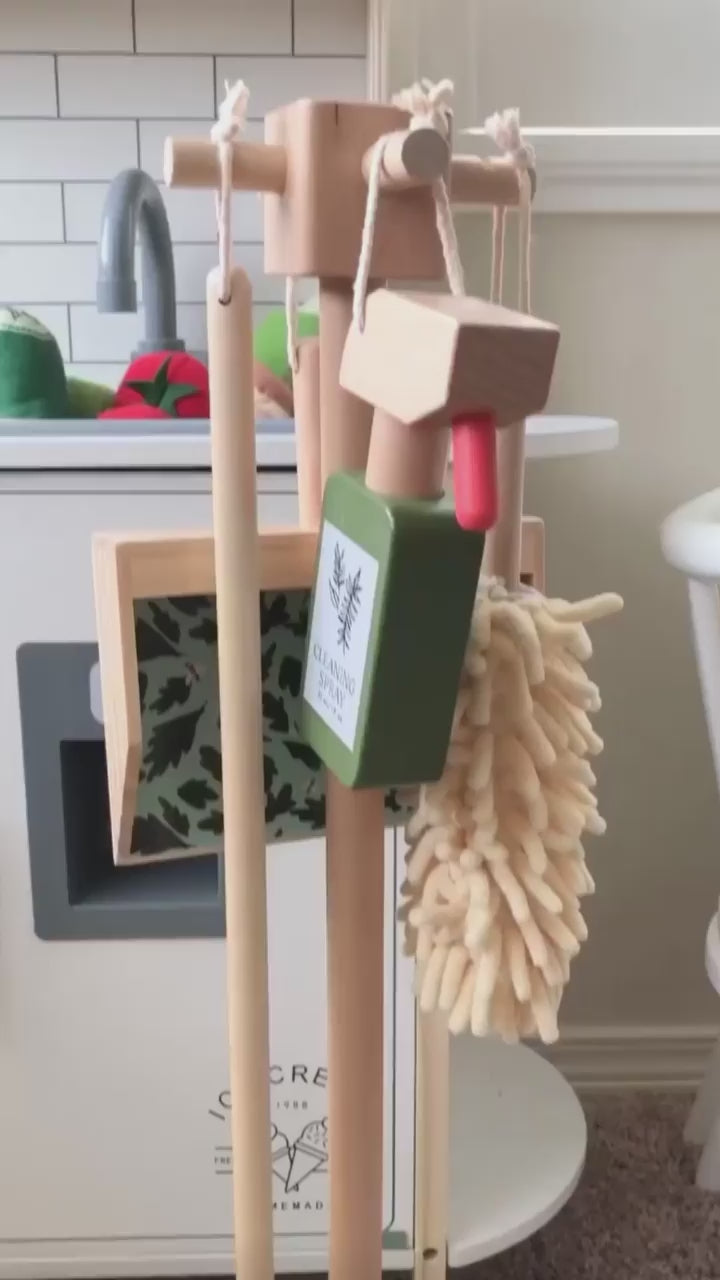 Ensemble de nettoyage de ménage en bois Manhattan Toy. Cet ensemble de jeu de six pièces est spécialement conçu pour les enfants. Embellissez votre temps de jeu imaginatif avec cet ensemble de nettoyage simulé. Comprend 1 balai à poils denses, 1 pelle à poussière, 1 flacon pulvérisateur, 1 plumeau avec un chiffon à poussière en tissu amovible et 1 support pour ranger toutes les fournitures. Tous les accessoires de nettoyage comportent des boucles en tissu pour les accrocher au support de rangement. De plus, le plumeau en tissu est lavable à la main ! Le jeu de rôle imaginatif sur le thème du nettoyage encourage le développement moteur, le jeu de rôle imaginatif et les compétences d'apprentissage social.