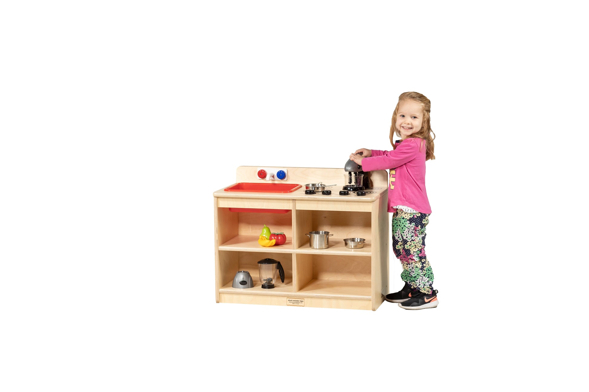 Fabriqué en bouleau baltique de 3/4 po. Livré avec des boutons de cuisinière, un évier et des robinets d'eau chaude/froide. Étagère de rangement ouverte pour que les tout-petits puissent y accéder facilement. Livré entièrement assemblé. À partir de 9 mois.