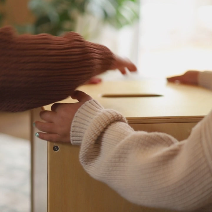 The box has a simple, minimalist design that aligns with the Montessori learning philosophy, which emphasizes hands-on, child-led learning through exploration and discovery. The clean lines and natural wood finish of the toy box promote a sense of calm and order, which can help children focus on their play and learning activities.