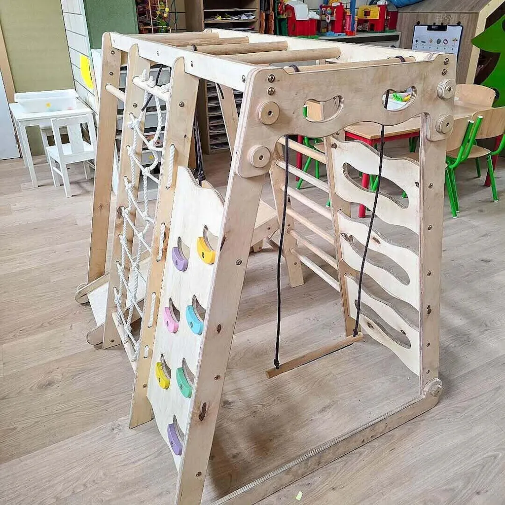 Our 6-in-1 playground is designed for children to spend time actively, develop coordination, strength and get the most out of the game. It includes a slide, swing, climbing frame, climbing net and the multifunctional playground itself. It is made of natural wood, carefully polished by hand for the absolute safety of kids.
