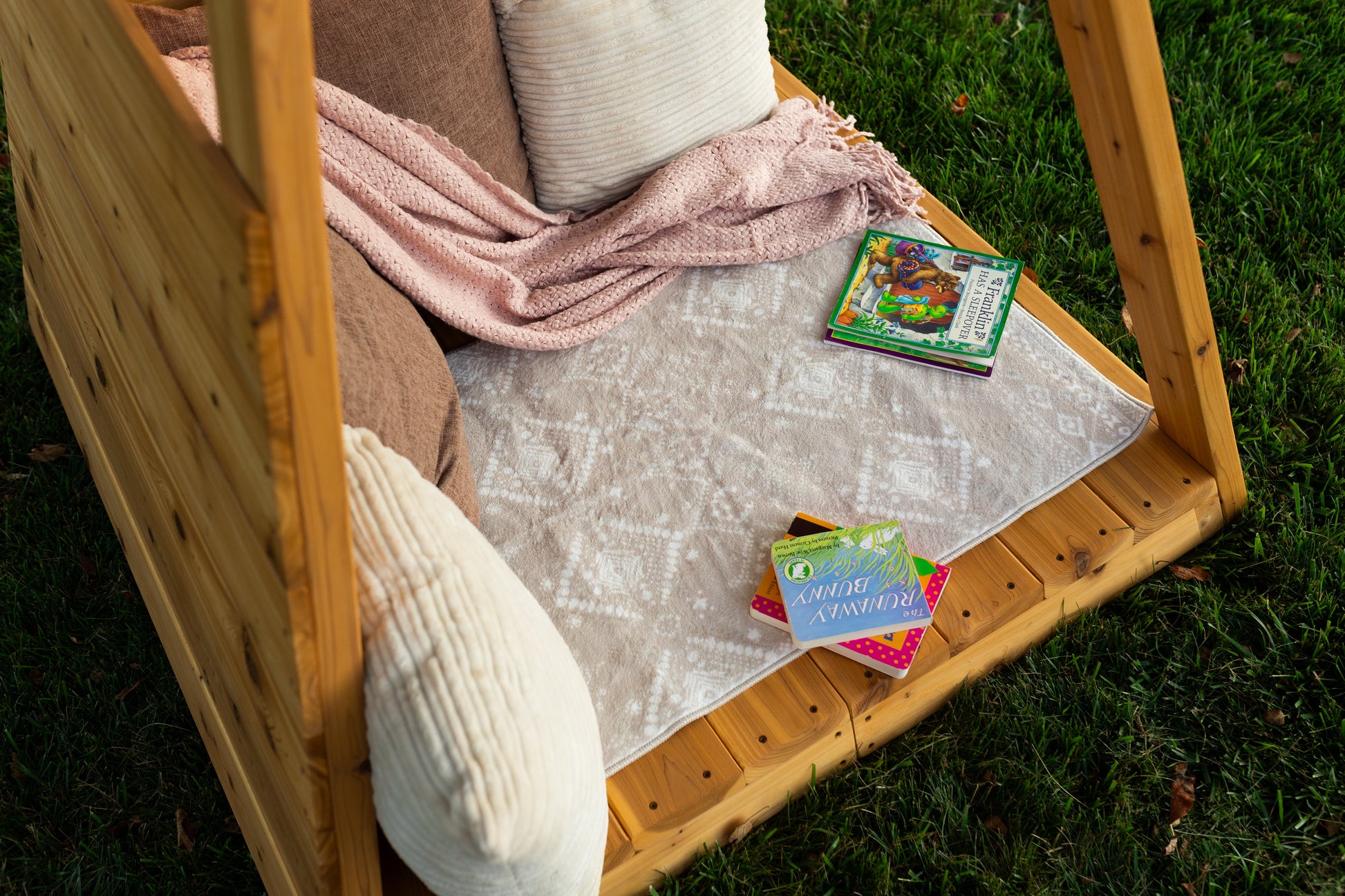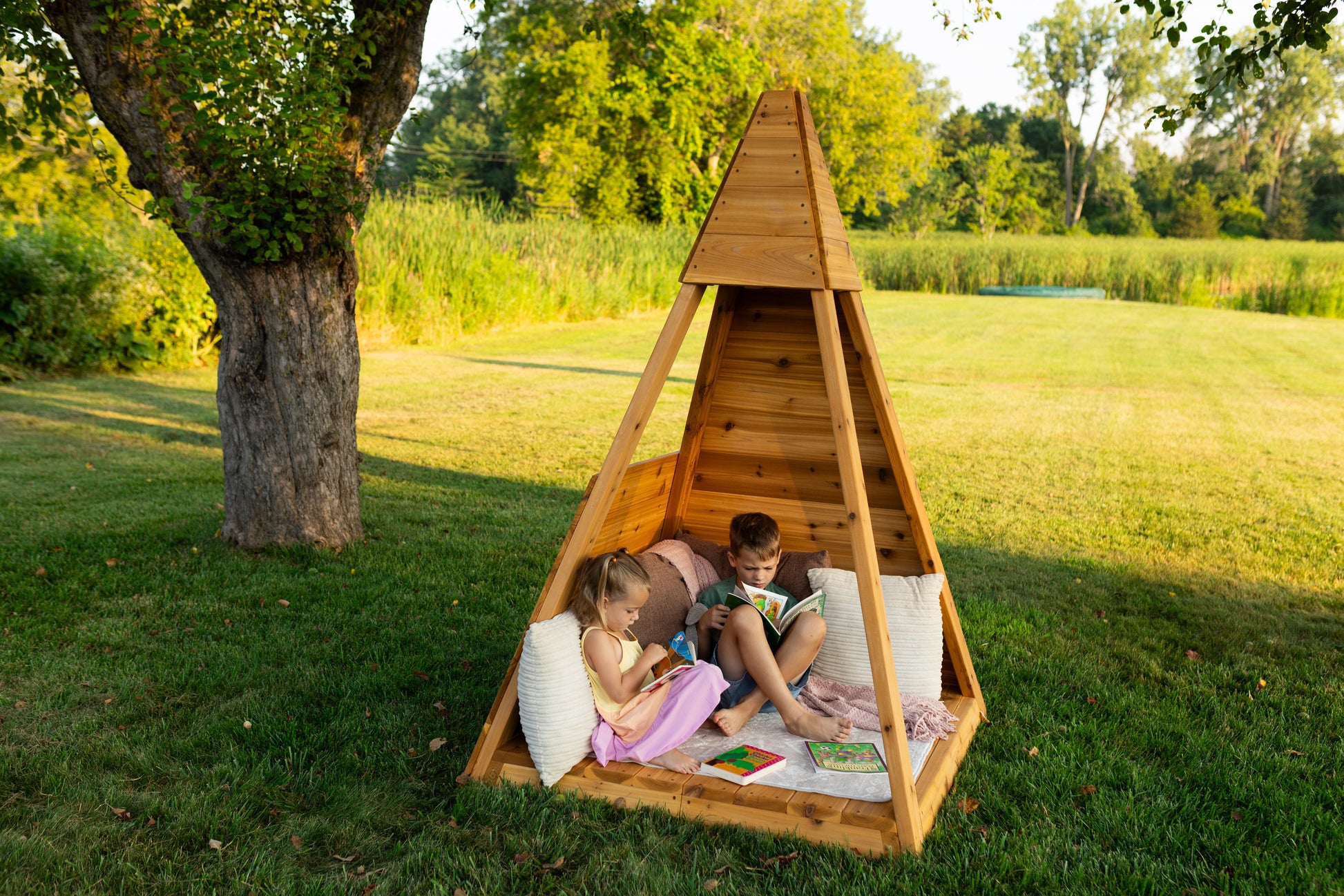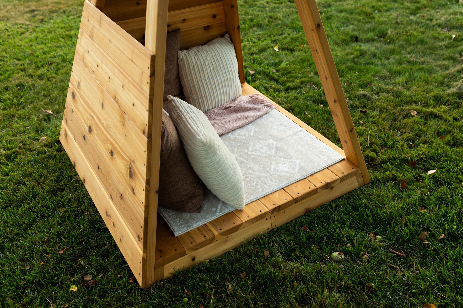 Featuring a charming A-frame design, smooth cedar finish, this lodge blends beautifully into natural surroundings while offering a functional, shaded space for children. Add your own pillows, blankets, or floor cushions for extra comfort and style.