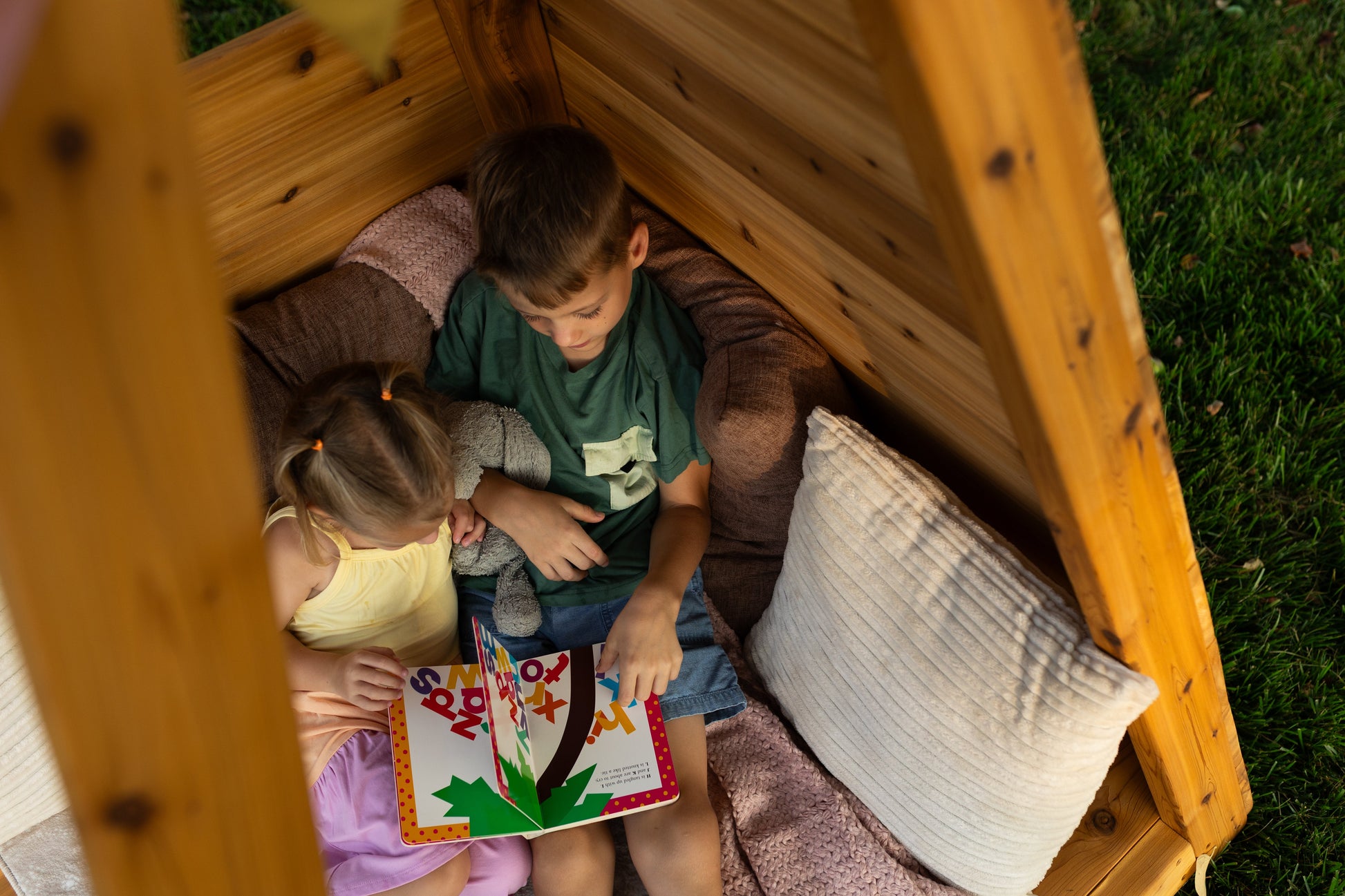 Create magical moments in your backyard with our handcrafted A-Frame Play House – a cozy outdoor reading nook designed to spark imagination and offer a peaceful retreat for little ones. Made from premium Western Red Cedar, this kid-sized house is perfect for curling up with a book, engaging in pretend play, or simply enjoying quiet time outdoors.