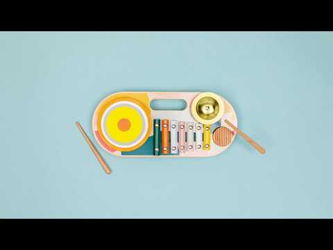 Beats to Go musical toy includes a drum, a pair of drumsticks, washboard, cymbal and 7-key xylophone. Three legs on the underside provide stabilization so little ones can jam on without their instrument wobbling away, Plus there's a handle on the side for easy carrying and elastic straps underneath for storing drumsticks.
