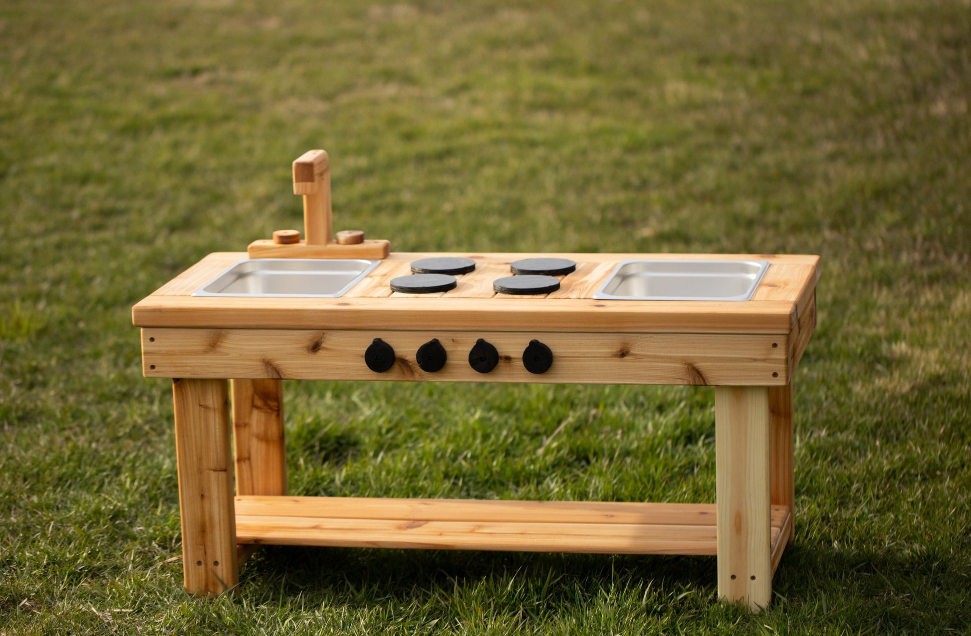 Choose your Faucet: No Faucet (note: no faucet of any kind is provided), Wood Faucet: great for pretend play, or Steel Faucet: made of stainless steel that includes hardware to attach to a garden hose!