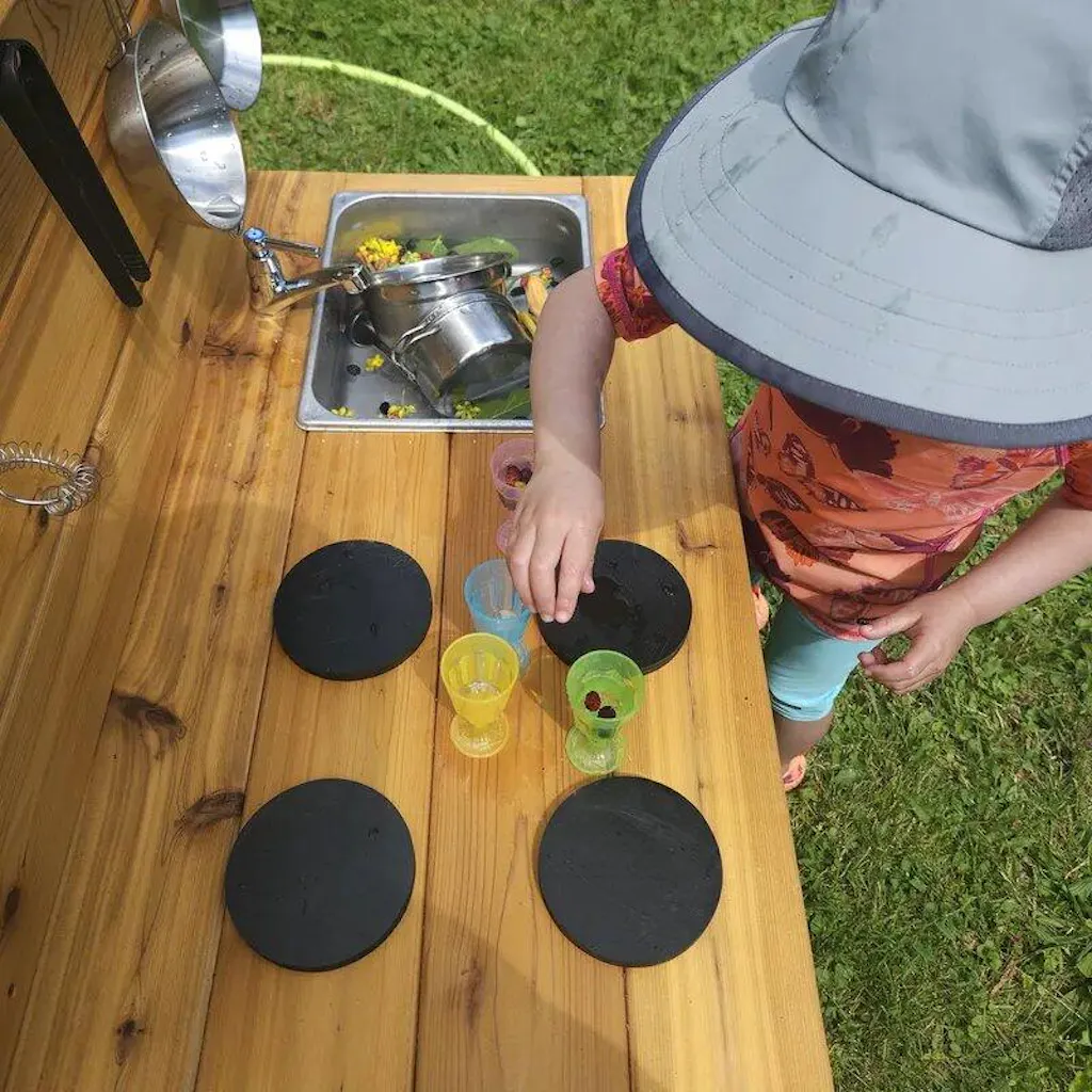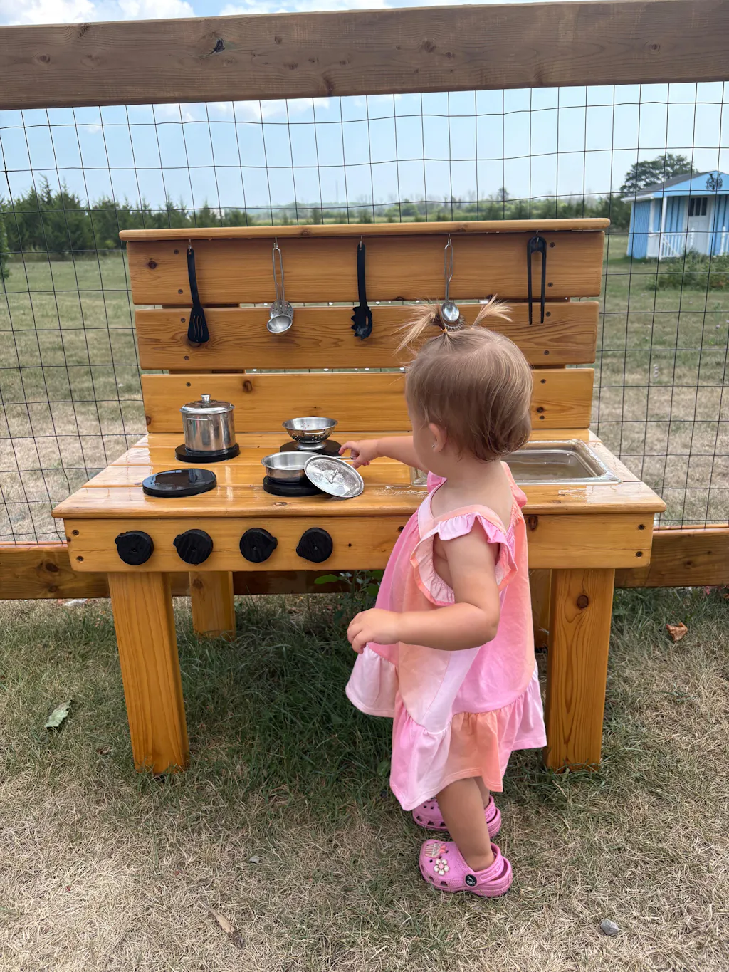 We purchased the Mini Mud Kitchen for my home daycare and I truly couldn’t be more impressed. My 6 little ones (aged 1-3) all absolutely love it. It’s the perfect size for all of them to participate, it’s fun and engaging and cleans up beautifully. It has also held up wonderfully in the summer heat! It is sturdy and incredibly well built. I am thrilled with the product and the licensing daycare plans to order more in the future! Thank you so much for proving my little ones with endless fun and laughter!