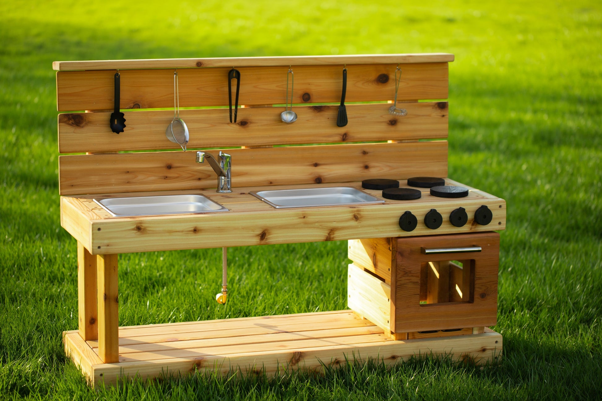 We love mud kitchens because children are free to get as messy as they want—since they are outdoors, of course! Sensory, messy, and pretend play are SO good for children. These lovely mud kitchens promote open-ended play, and There are endless possibilities: mud soup, a pretend cafe, or filling the sinks with sensory items such as rainbow rice and water beads are just a few examples!