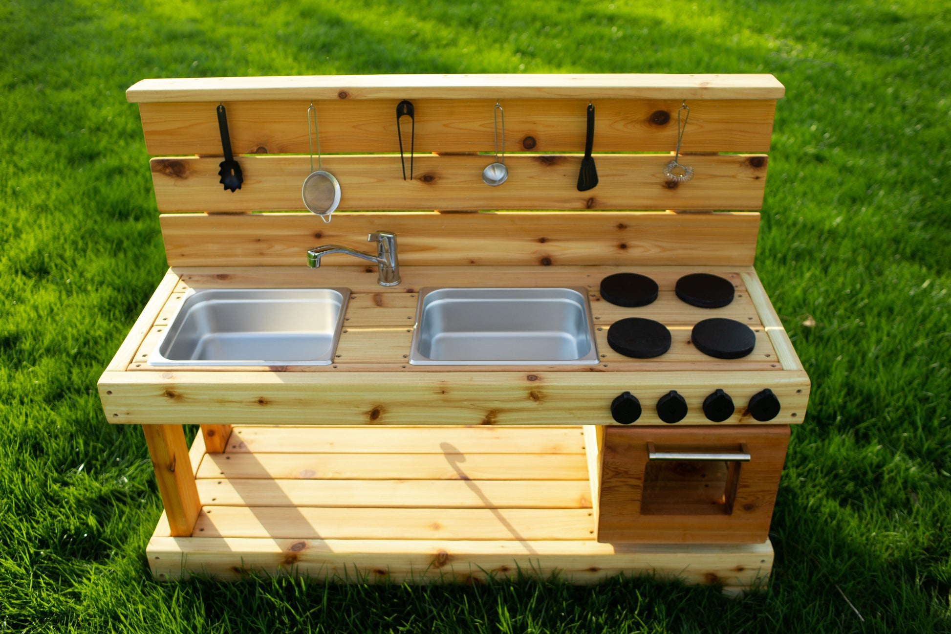 - Comes with an oven & stovetop and the option to add on a WORKING faucet compatible with an outdoor hose (all attachment hardware included with add-on).