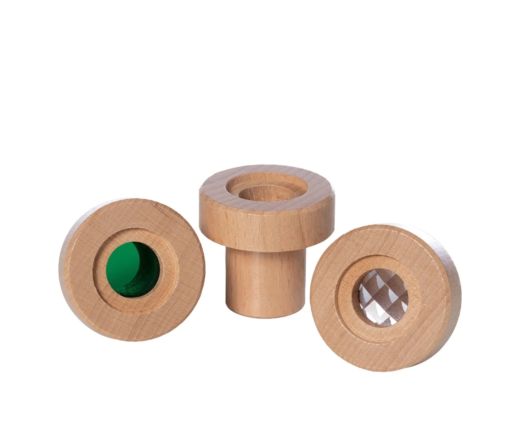 Strike a pose! This four-piece set includes a wooden camera body and attached neck strap with three interchangeable lenses: clear, green and kaleidoscope. Woven fabric strap can open and close so little ones can capture the moment with ease. Fosters imaginative role play, as well as visual, cognitive, and social-emotional development.