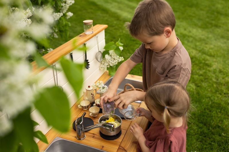 Choose your Faucet: No Faucet (note: no faucet of any kind is provided), Wood Faucet: great for pretend play, or Steel Faucet: made of stainless steel that includes hardware to attach to a garden hose!