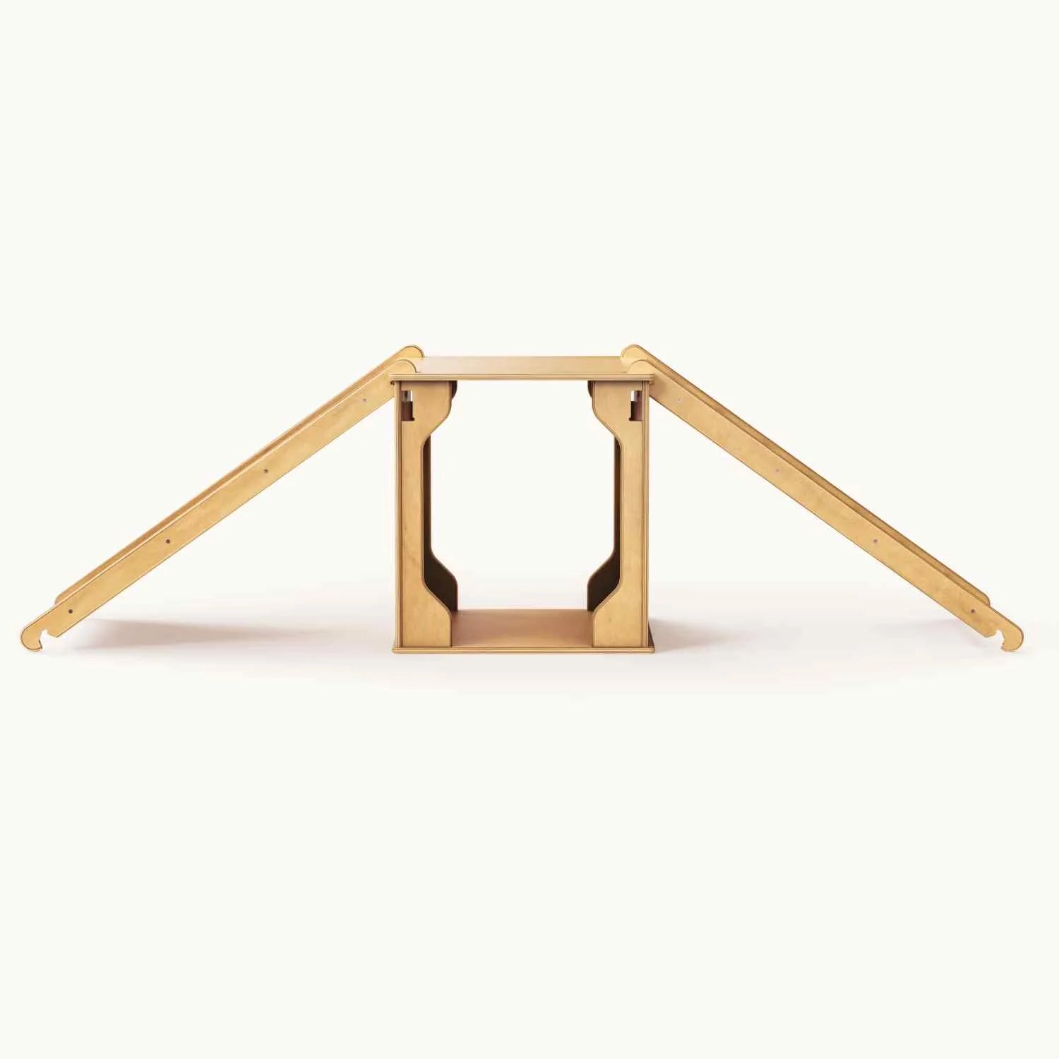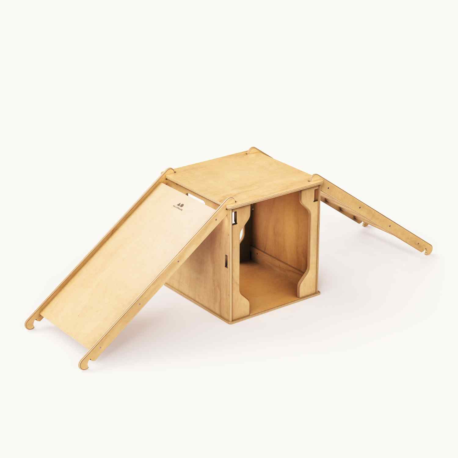 The Mountain Top is the configuration of the PlayBox play system comprised of the Box, the Ramp, and the Ladder, making it a perfect wooden climber. With a max height of 19.7 in (50cm), the Mountain Top has a minimal footprint and a challenging terrain for children ages 2 to 9 years. Your kids will be sure to enjoy the cave inside the heart of the mountain!
