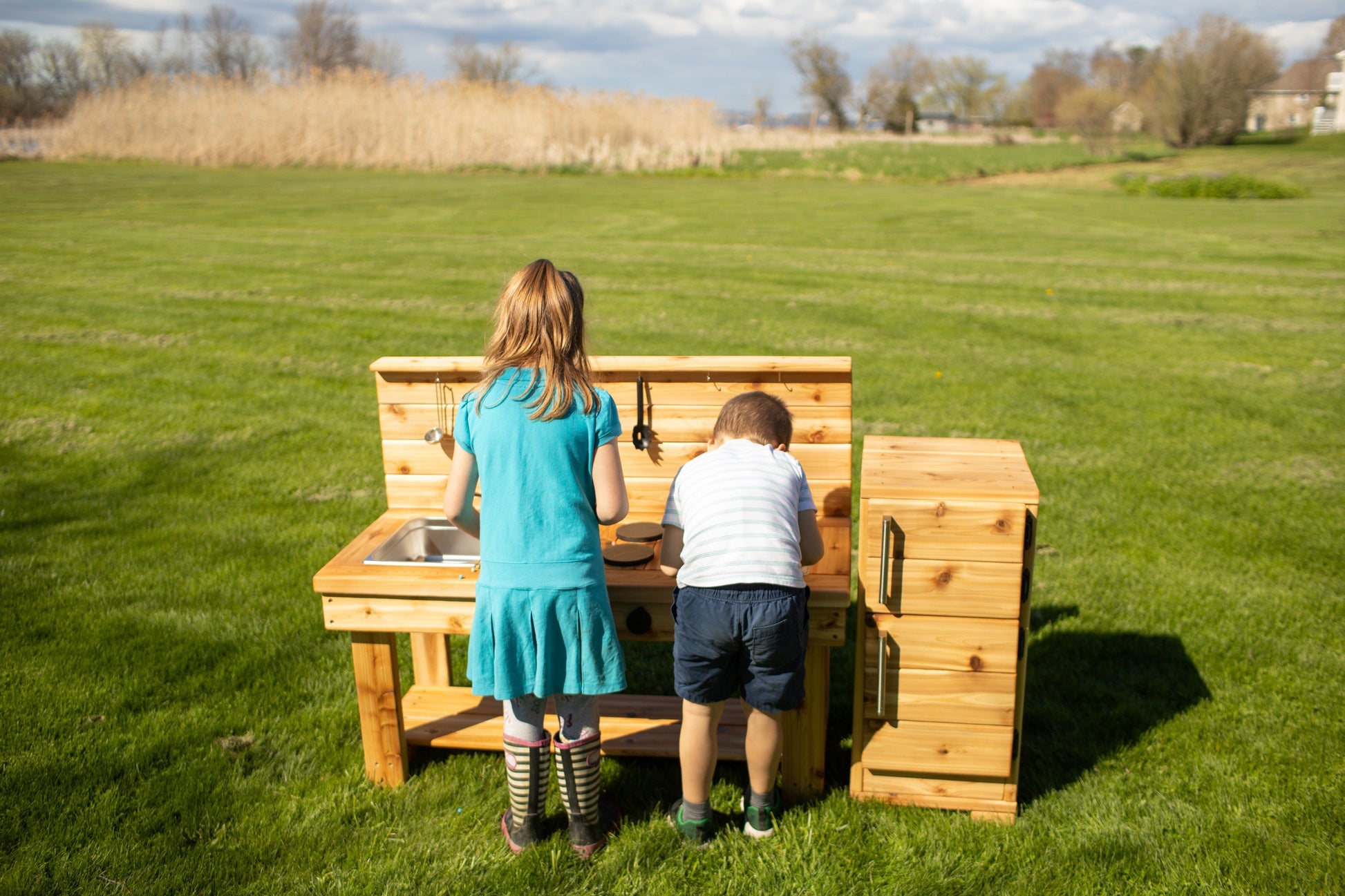 Transform your child’s outdoor playtime with our handmade Simple Kitchen with an attached backsplash. This elegant and durable mud kitchen is crafted with meticulous attention to detail in our small wood shop in Ontario, Canada. Designed to inspire creativity and withstand the test of time, it’s the perfect addition to any backyard.