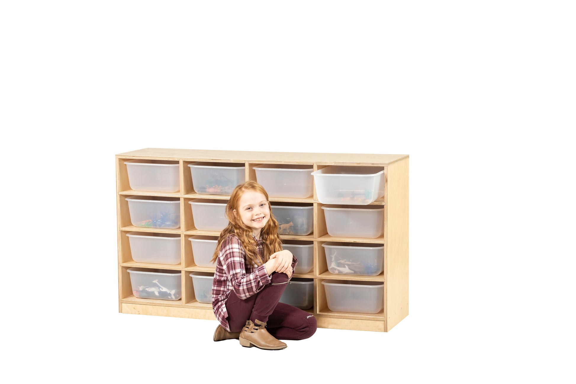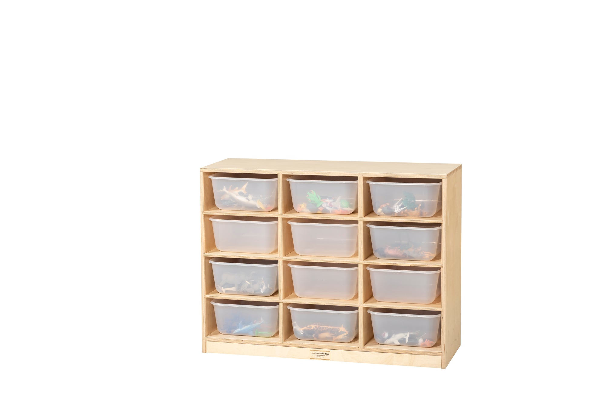 Keep your toys and learning materials accessible and visible with this set of translucent bins in a birch storage unit from Stock Wooden Toys.