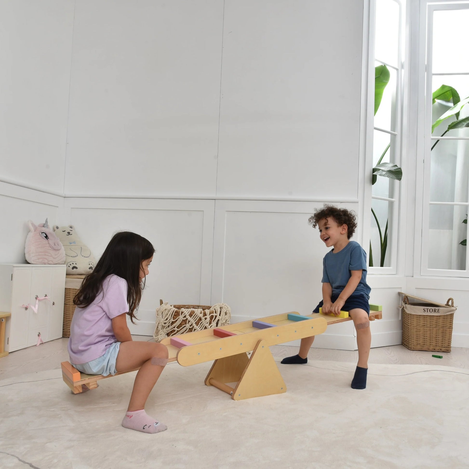 Meet the Willow - a rainbow seesaw and balance beam that's about to become your child's favorite way to play! This nifty piece of play equipment does wonders for young adventurers, blending the thrill of a seesaw with the skill-building prowess of a balance beam.